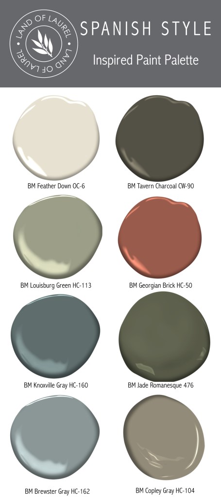 Spanish style homes are the types of home that can take a good dose of color in the secondary spaces which is what I had planned for this palette. The main paint would wrap through the majority of the house and be the light and bright white Feather Down and would contrast from the dark Tavern Charcoal trim paint. The master bedroom would get a splash of Louisburg Green paint which would create a great backdrop for bold reds in textiles like bedding. A master bathroom vanity or living room architectural element would be highlighted in Georgian Brick. Kitchen Cabinets would be painted Brewster Gray, a sophisticated blue tone that looks great with copper and iron. A powder bathroom or even pantry near the kitchen would be a step darker in Knoxville Gray. Guest rooms would round out the palette with Jade Romanesque in a darker north facing room and Copley Grey in a more subtle, brightly lit space.