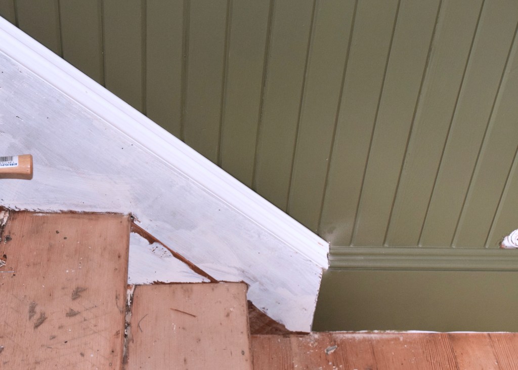 I also worked with all of one part of the wainscotting before moving on to the next. I started with the V-groove boards then did the baseboard mouldings and finally the top of the wainscotting. Also you can see in this picture below that I hadn’t skimmed the walls yet. That was a mid-wainscotting installation project.