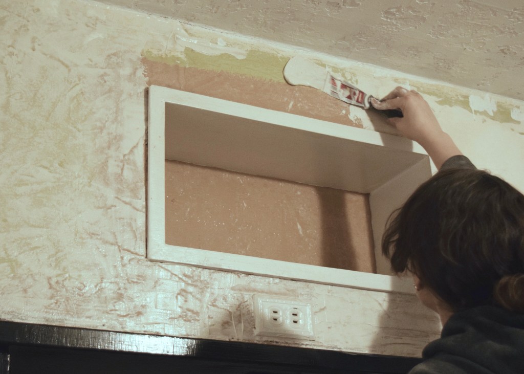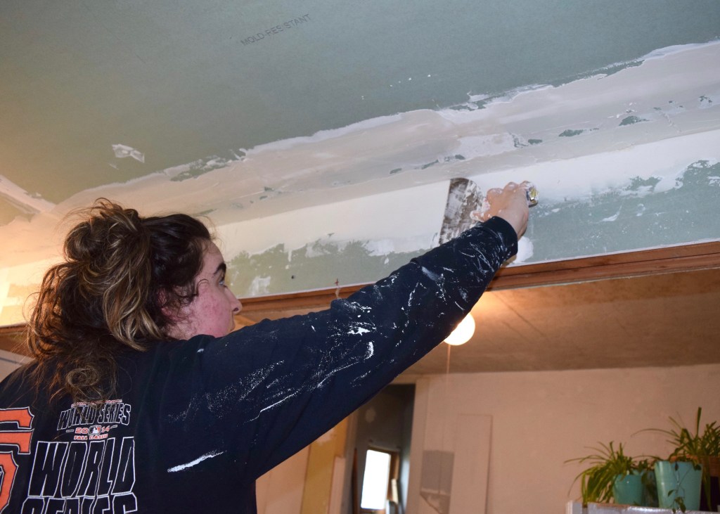 My sister tackled the new drywall areas, mudding and sanding in the same way I had done in the bathroom. It was her first time doing this and she loved it!