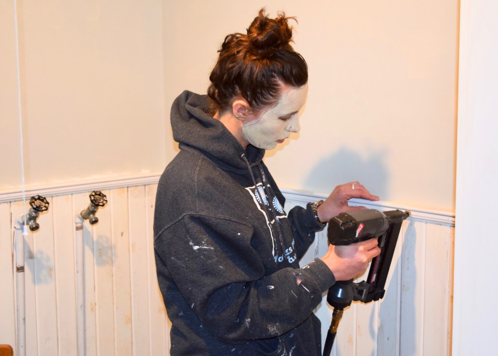 With 7 different pieces of moulding, I used a lot of nails. I stuck with 2″ nails for the V-groove boards and baseboards but switched to 1.25″ nails for the quarterround and decorative trim pieces. I also look rather deranged while nailgunning apparently. You’re welcome for this face of confused concentration.