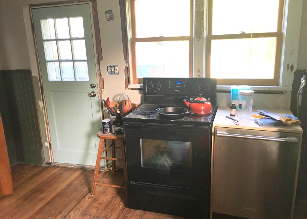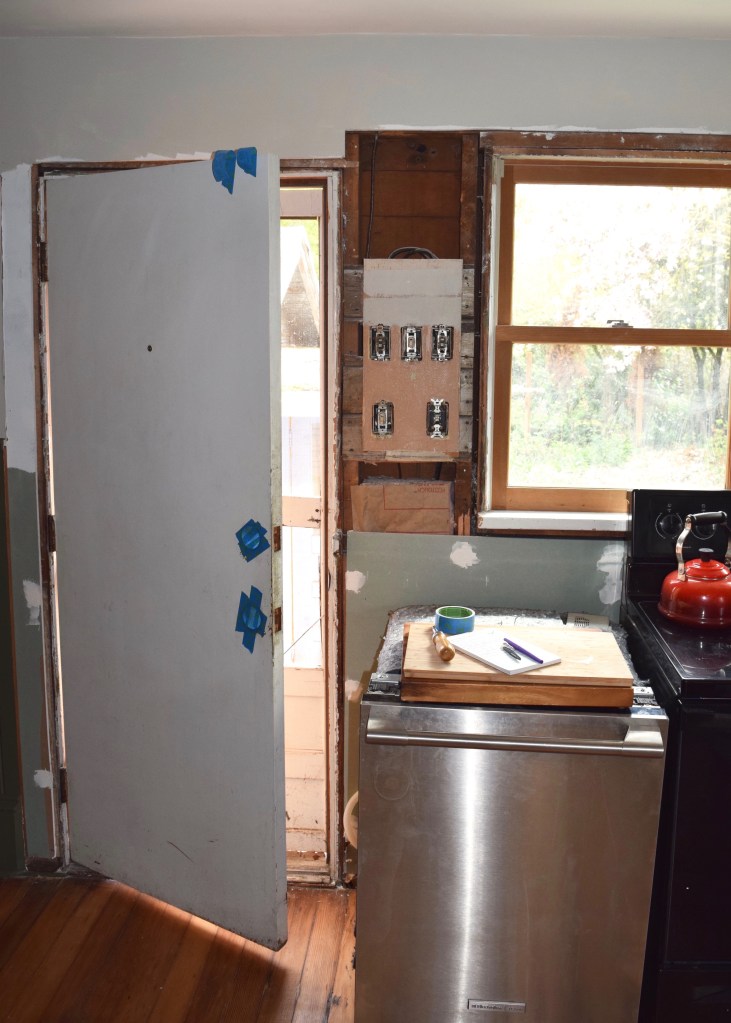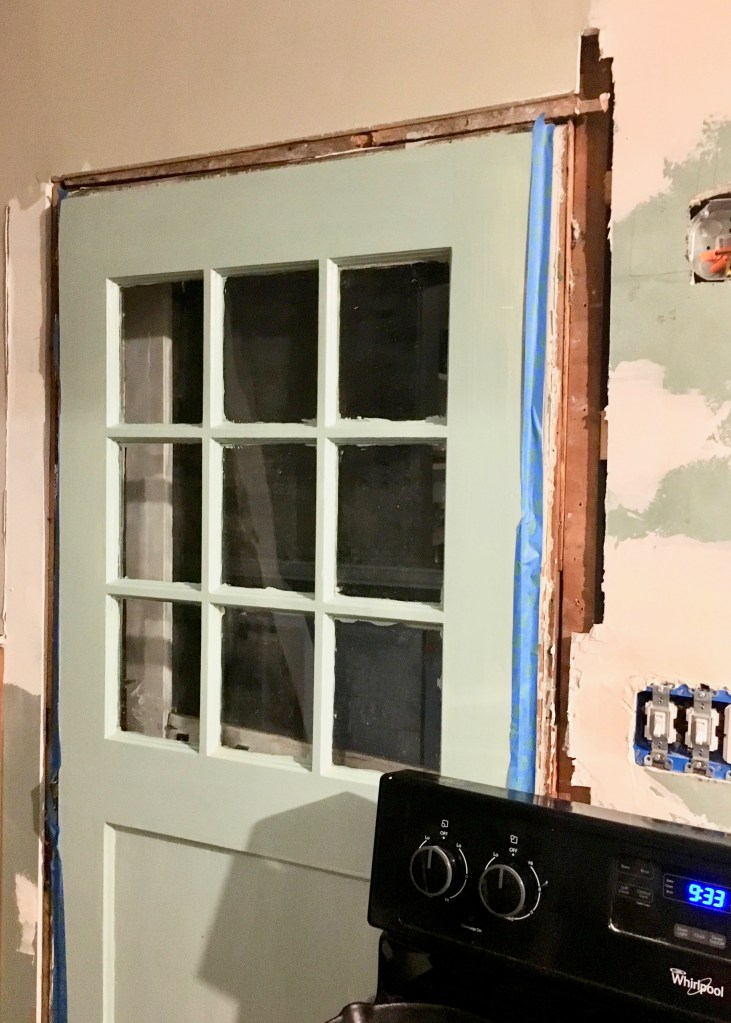I bought a new-to-me older half-lite door on Craigslist. The glazing on the upper part of the door allows so much more light and views of the backyard! The old electrical got removed and I wired it for a sconce too. I got the door hung one day with the help of my neighbor Erik, but I didn’t have time to install the hardware, so I slung the oven in front of the door and called it “secure” for the night. Good thing Portland is such a safe city!
