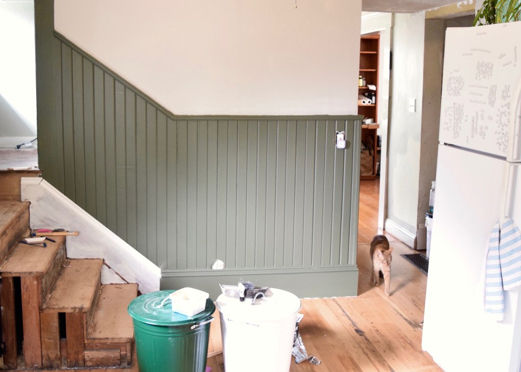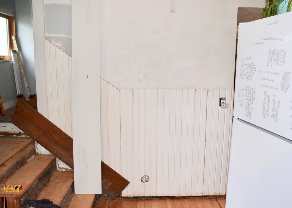 It’s easy to install wainscotting, just nail it up! Since my walls are full of late and plaster, studs, old siding, etc I didn’t bother worrying about backing or adding glue to this (and since I worked on this part of the kitchen a while back, I can assure you, it’s holding up more than fine).