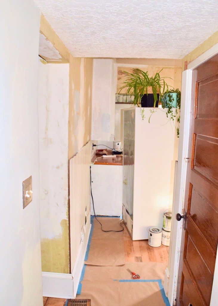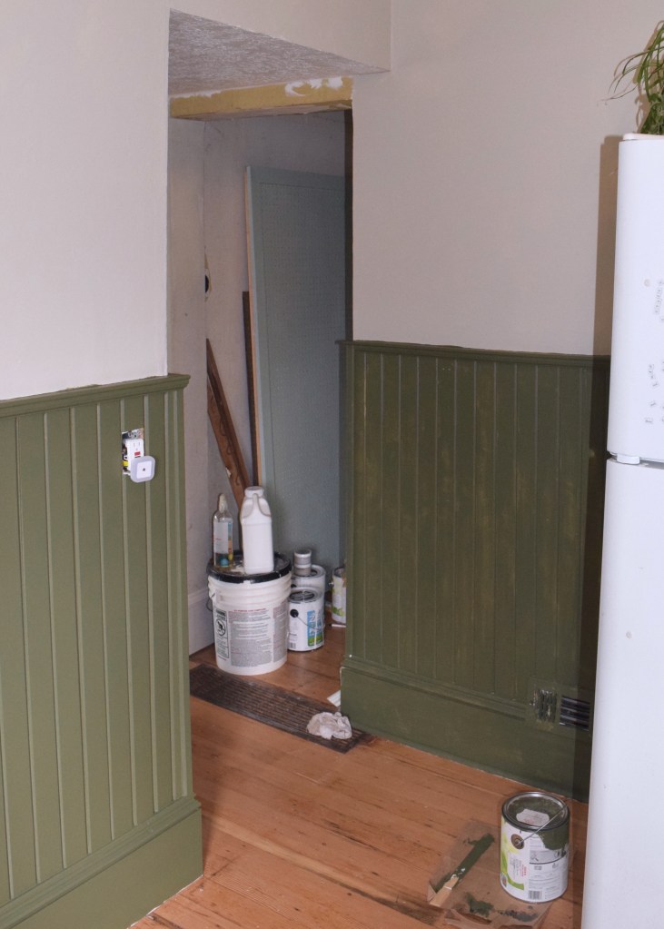 This weird little corner where my future dishwasher would hook in looked so good it had me screaming! Doesn’t the wainscotting make the space feel so much more old world? I also cased the opening between the two parts of the kitchen to make that more intentional too. A house of this age shouldn’t have any drywalled openings, they should all be cased (meaning trimmed out with wood).