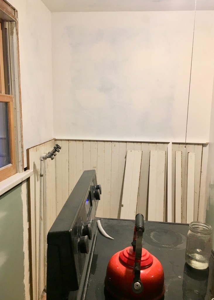 While Bronwyn was working in the back section of the kitchen I was in the front. My neighbor came over one night and convinced me I needed to skim all my walls to cover up with weird warty rock texture that was left behind by layers of wallpaper over homasote. He skimmed this whole wall which was very effective at convincing me to do the rest.