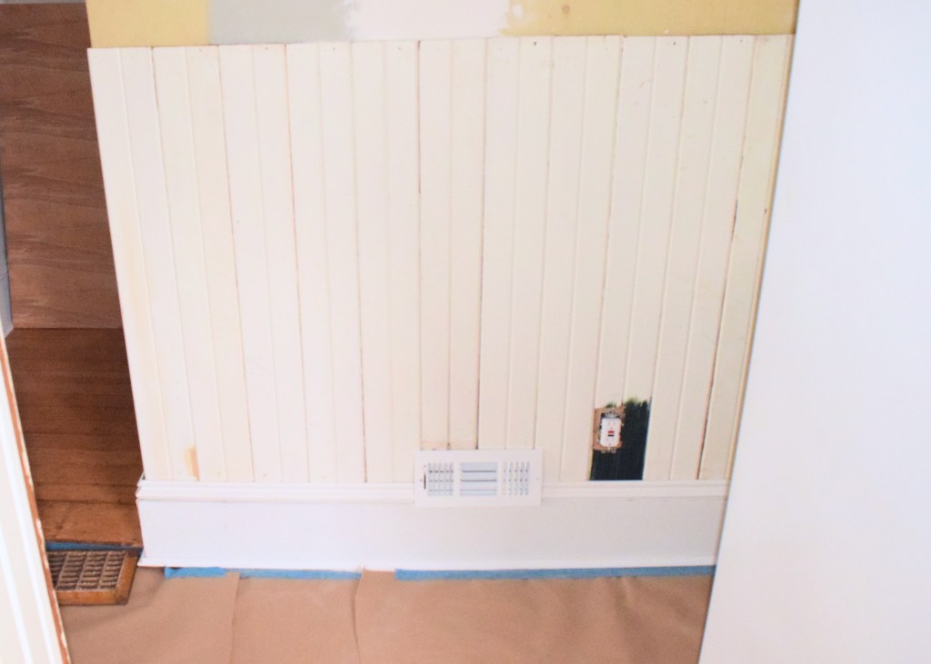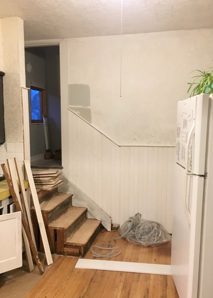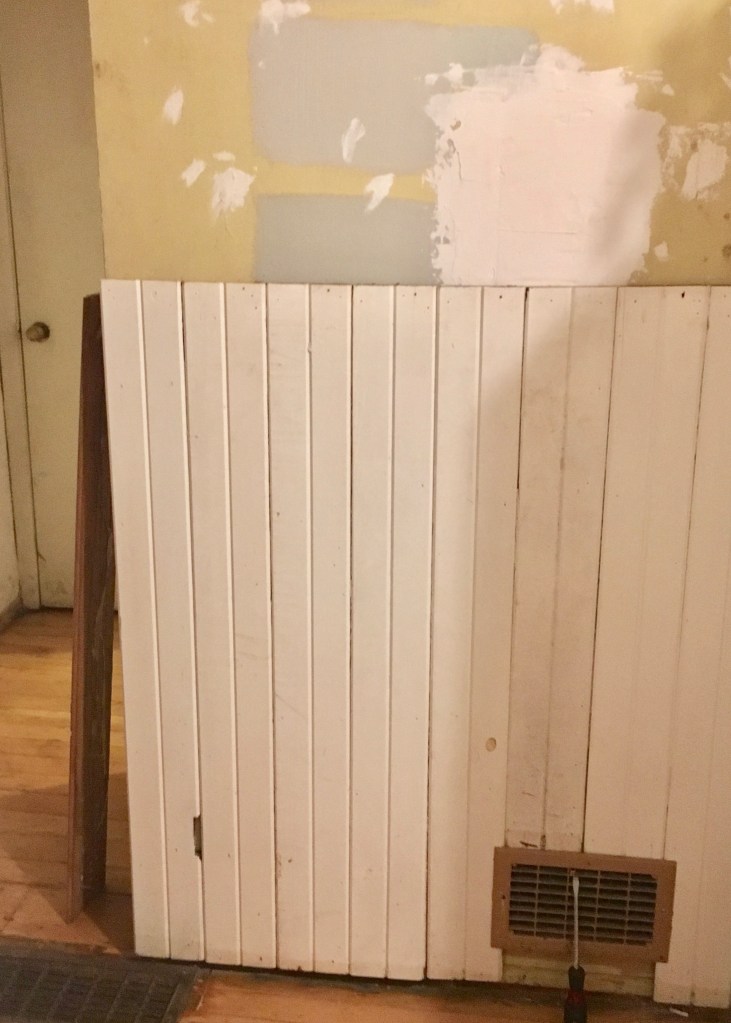 The wainscotting was used and beaten up in the most perfect patina’ed way. It wasn’t 100 years old, but it was true solid wood wainscotting. When it was last installed someone used adhesive and nails though, so it was definitely from the last 50-60 years. The wainscotting is exactly what this kitchen needed to make it feel more like an old house and less like one that went through a series of bad renovations in the middle of the last century.
