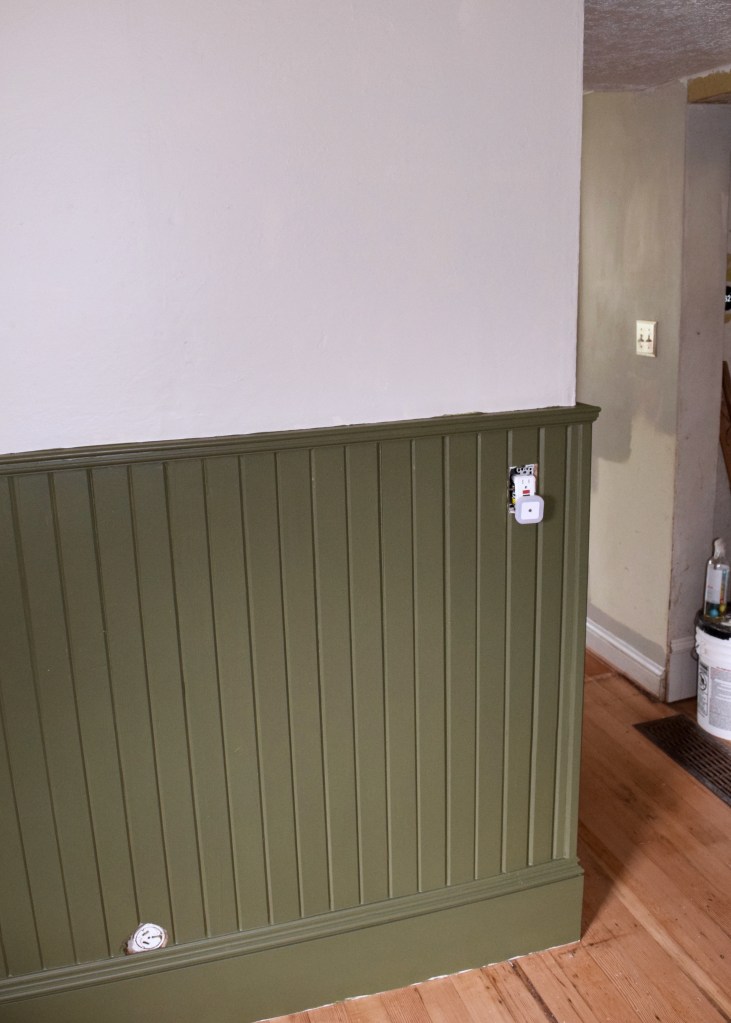 You can see my line where the wainscotting meets the wall isn’t great here, but don’t worry. I always circle back to cut in the wall paint last since it’s much easier to create a crisp line that way.