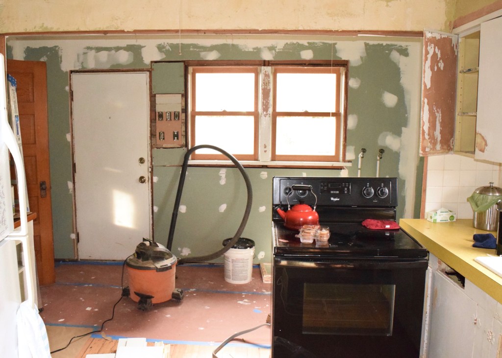 Before anything further could happen in this space, we needed to give the walls themselves some attention. Originally this room was wallpapered and we ripped that down the first week I moved in. Then when my family was in town to help prep the floors for refinishing, we demo’ed the back part of the kitchen down to the studs, insulated, and re-drywalled everything. It looked better, but it certainly was not “done.” So when it was time to address the kitchen again, first I needed to tackle the walls.
