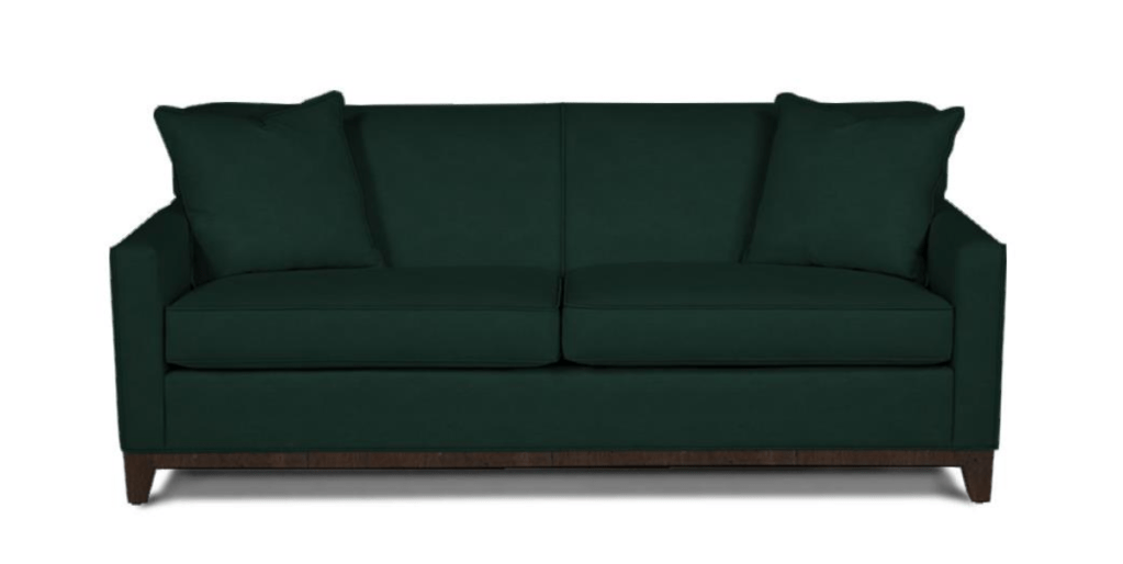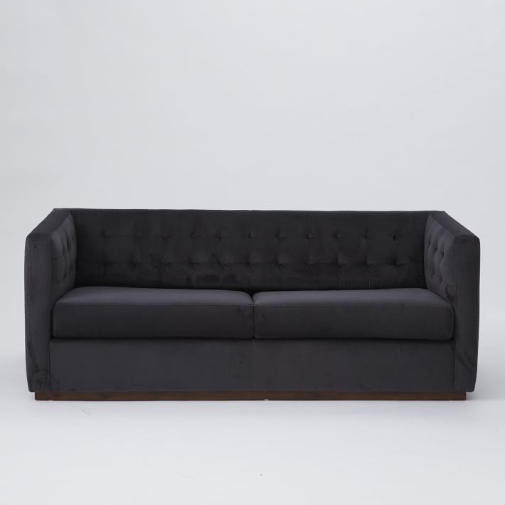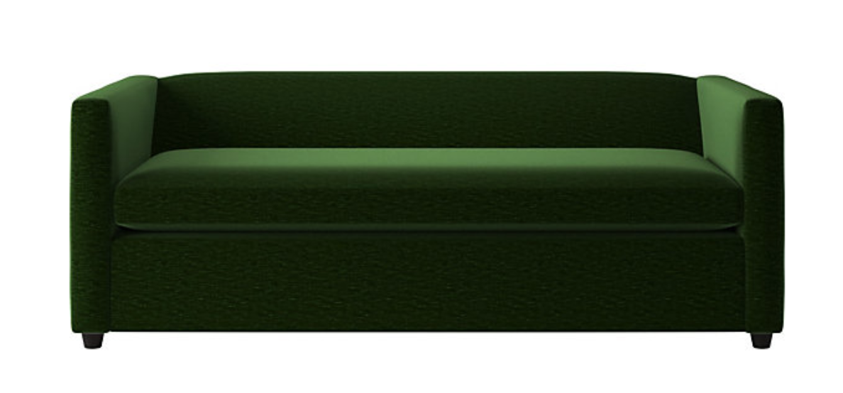 I considered the Rochester sofa from West Elm for a long while. It’s so pretty and I love it in a green performance velvet! The plinth base is great since pet hair and pet toys can’t get trapped underneath. The only downside? The tufting is on the inside of the sofa, not the exterior. Whomp, whomp, whomp.