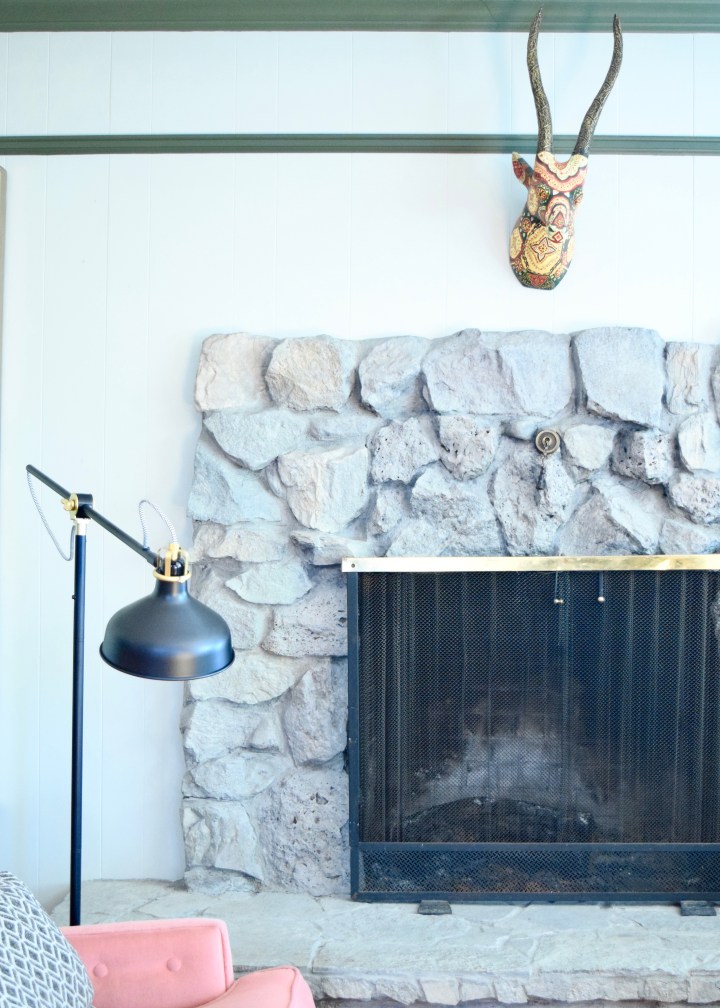 One of the most quick and gratifying projects to date at Berrybrier was the transformation of the Living Room Fireplace. This DIY only took an hour and gave the old stone fireplace a completely new feel. Before it was boldly colorful and stained with soot. Now it’s modern and calming, more of a textural element than color!
