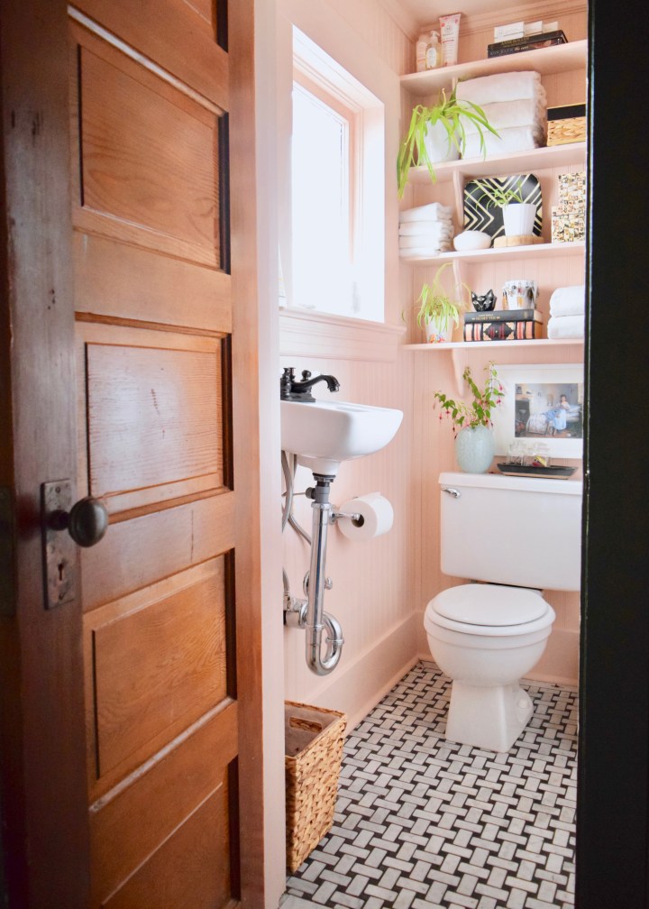 Meet the world’s tiniest Master “Bathroom”! It’s really a half-bath or powder room, but it’s located off my Master Bedroom, so we’re calling it the Master Powder Room now. All capitals because that makes it OFFICIAL. I fixed up this space for the One Room Challenge in the Spring and spent less than $600 for the entire gut renovation! This room was featured on Apartment Therapy and even made it on two of their end of year lists: The Best Bold Wall Color Transformations We Saw This Year and The Best Under-$1000 Budget Renovations We Saw This Year. Pretty exciting!