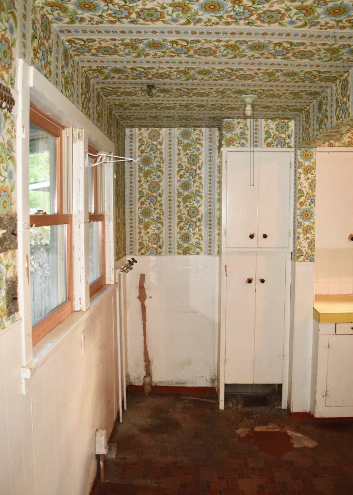 One of my favorite corners of my newly refreshed kitchen is this awkward little one in the corner! Before my kitchen renovation the corner was looking really rough with chaotic 70’s wallpaper, a musty cabinet, and flaking vinyl floors. The stove needed to go below the windows in the appliance outlet and I planned to add cabinets on either side. But you know this already!