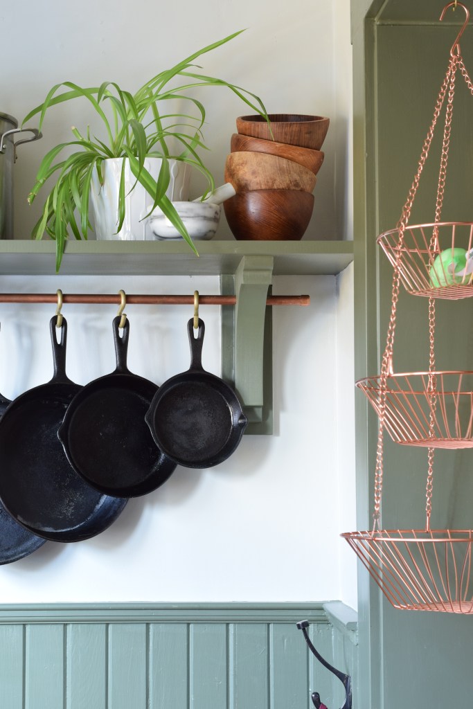 And boy does it feel good to breath more life into this corner! I’ve styled the shelves a couple of different ways now. I do love a functional surface I can also make pretty. It’s so nice to be able to store my most used pans and pots right within easy reach of the stove in such an accessible manner.