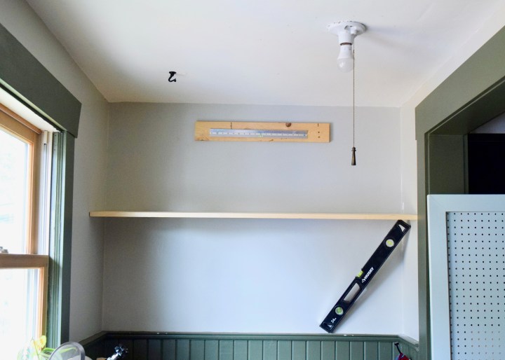 I knew I wanted a deeper shelf, so I bought a 1×12 at my local lumber yard. I cut it to size and propped it up in place. You can see the pegboard here that I used previously in this spot. It covered up so much of the wainscotting and wasn’t functioning well with multiple people utilizing (and forgetting where things laid out on the pegboard).