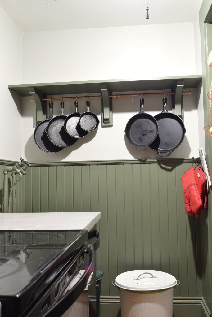 This is how things shook out after the renovation. The stove and cabinets created a ton of function on the exterior wall, but the little corner in the back needed to pack in some storage as well. I wanted something to hold all my pots and pans that would be easy to put things away on.