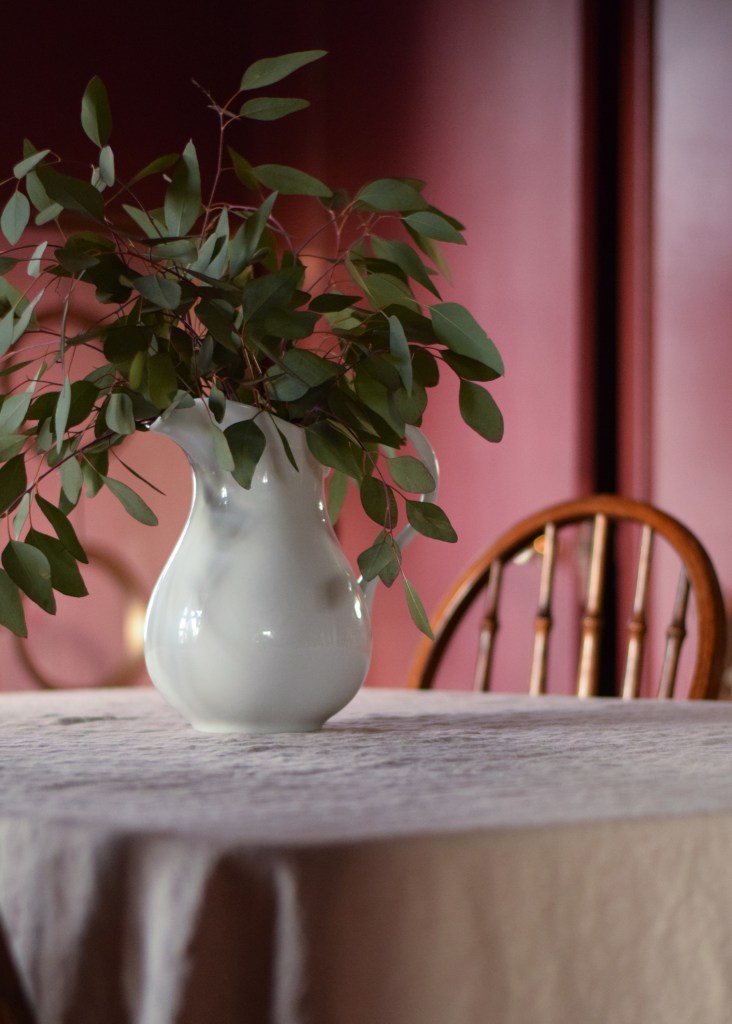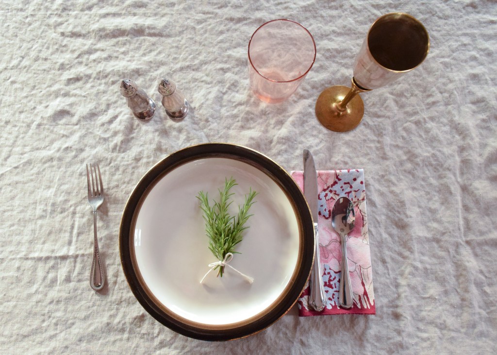 I wanted to imagine how I’d style the table for a spring gathering even more though, so I amped up my game and begin to toy around with my things until I landed with this below! The finishing touch of a sweet sprig of rosemary tied with twine feels spring-y, while also nodding to my favorite herb (I snip it from my garden all year long!). I love this simple linen table cloth (it’s from Target!), because it doesn’t have to be ironed and just epitomizes the casual spring feeling in the air to me.