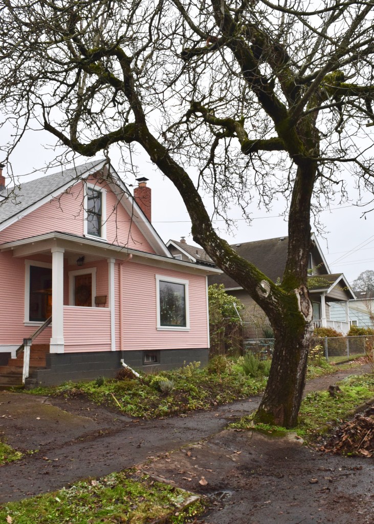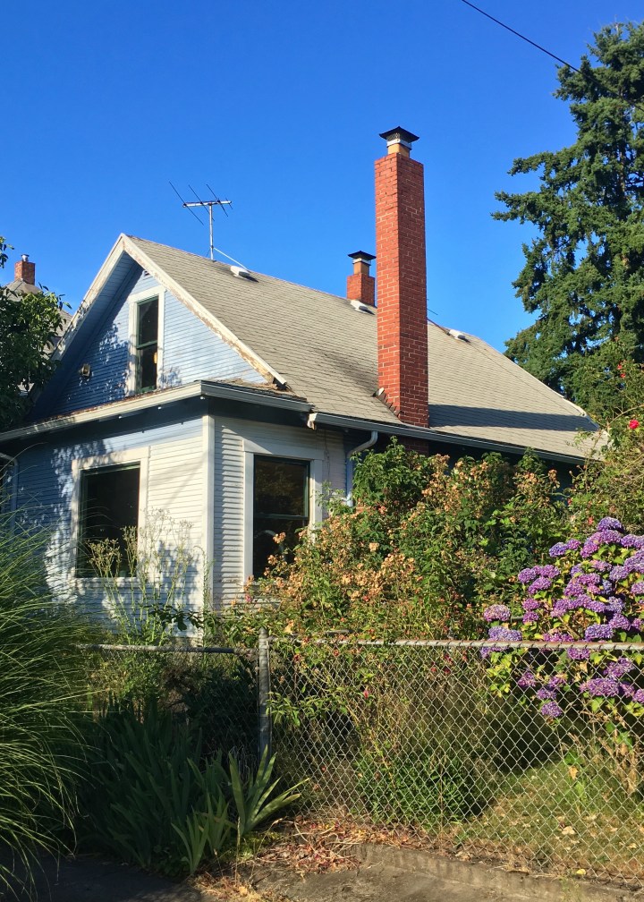 Now that you know the plan, we have to take a look at the history of the front yard! I can’t not show you the front of the house from when I bought it in the summer of 2017. The garden was crazy! The 2′ wide parking strip was incredibly overgrown with with bamboo, a palm tree, banana plants, a giant oddly shaped forsythia, and an absolutely ginormous hydrangea that was eating away at a tall grass. All of it was far too large for the small parking strip and blocked a lot of the garden and obscured a large part of the house too.