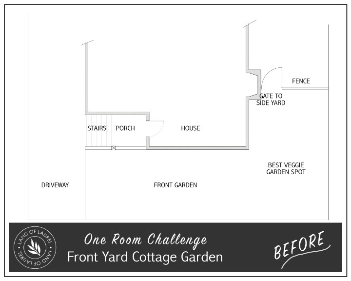 Now the backyard is a whole adventure to untangle over the course of several years, but the front yard? The front yard is doable. The front yard needs some structure and love, but it could be a wonderful place to spend time and its gardens could set the tone for the whole house. So for this season’s One Room Challenge, I’ve settled on the front yard as my room! I’ll be carving out space for a veggie garden and a seating area within the existing footprint too.