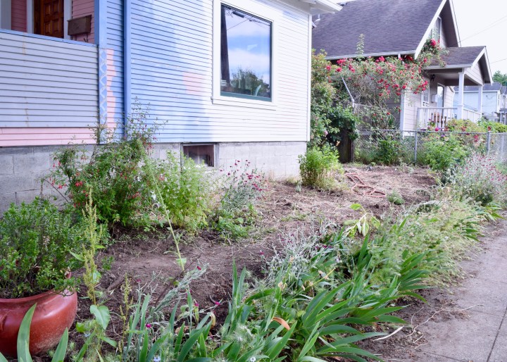 In early summer of 2018 (mid-painting debacle), I posted the chain link fence on craigslist as free if you dug it up. Miraculously someone came by and did all that hardwork for me! I can’t really change the chainlink fence bordering my neighbors’ yards, but this felt like a huge improvement! with the fence gone I felt like the garden was so much larger and the iris border at the front of the yard made a whole lot less sense.