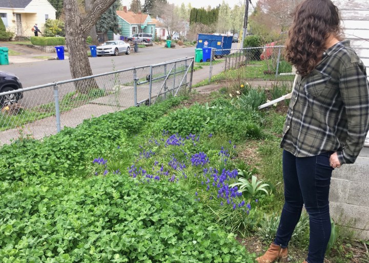 The first summer I lived here (2017), my cousins Mary and Ted came out each day to help tackle the chaos of the garden and removed all the weeds and cut back the plants. I planted clover in the fall. A friend took this picture of me admiring my clover in March 2018. You can see the chain link fence here and the walnut tree beyond it.