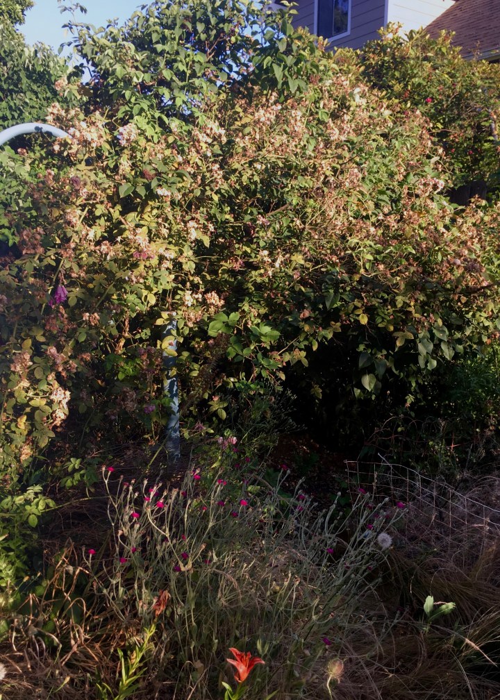 Here’s a closer view of that corner. Irises in front of a chain link fence and overgrown rosh bushes competing for space with a lilac bush, weeds and random flowers scattered throughout the rest of the space.