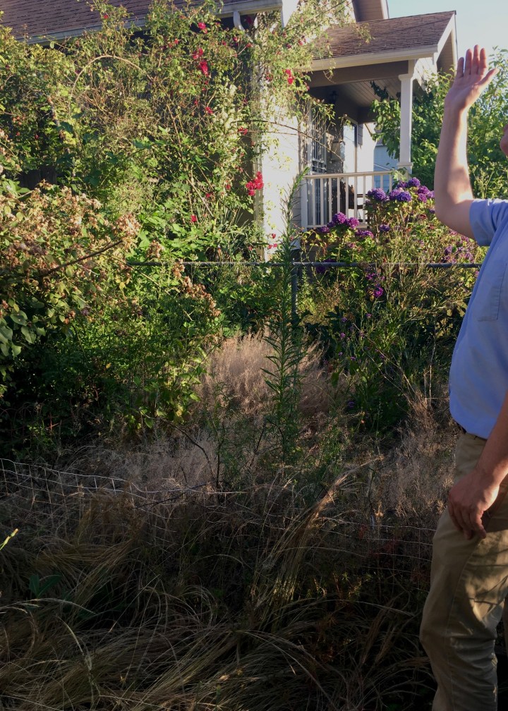 Looking towards my neighbor’s house from here you can see more plants and a small low fence. Buried in there was a raised bed! You can see the chain link fence that divides our properties as well.
