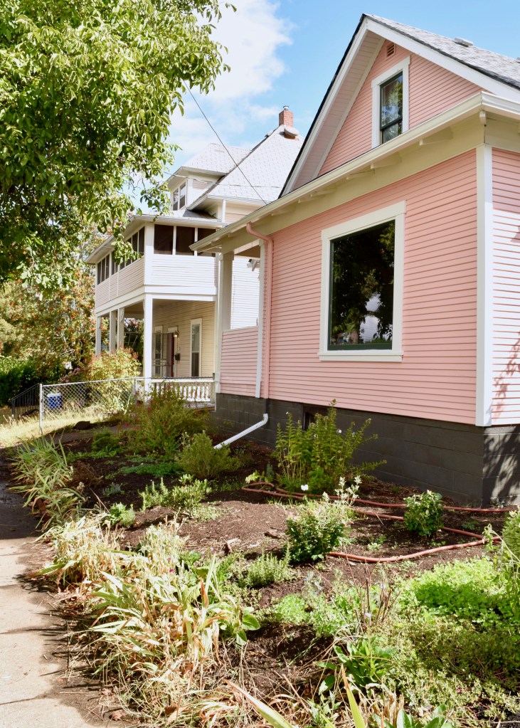 By the end of the summer of 2018, the house had finally been painted this happy coral color! The irises looked rough at the end of the season, but I’d begun planting random things in the yard, hoping to fill in some of the empty space. Since there is a not a hose bib at the front of the house, I dragged a heavy hose from the backyard and ended up just leaving it in the front for the summer (not classy, but it was sooo heavy and frustrating to move!)