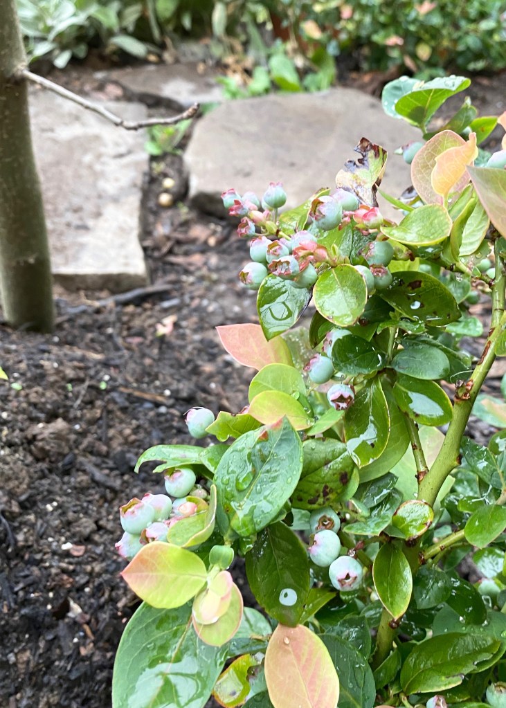 I am still waiting for many of the summer flower to bloom and I am admiring the beginnings of the unripened blueberries. The plants are just bursting with berries and I can’t wait to harvest!
