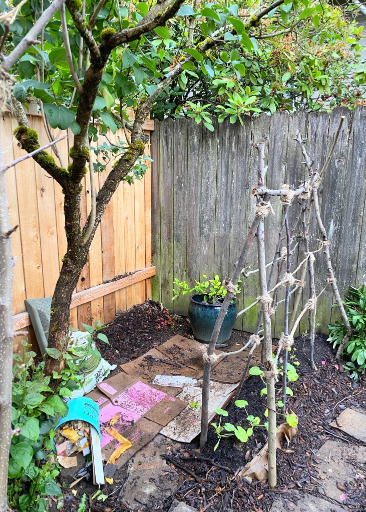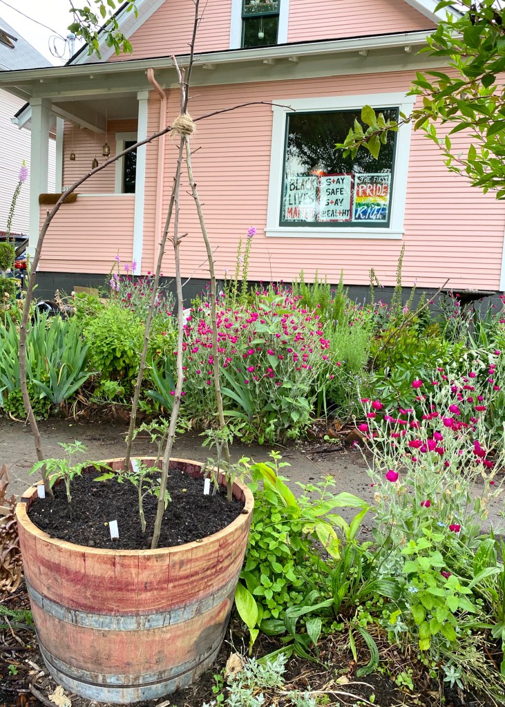 I ended up buying the barrels at the end of the sale day, so the seller threw in a half barrel for only $10 more. It’s now sitting in my parking strip for the season where it will soon be laden with tomatoes (I had sooo many tomato plants y’all!). One of my branches is so far from straight on this little pyramid trellis. It makes me laugh so hard. But! It’s what I had on hand for free and it makes sense to be a bit thrifty right now.
