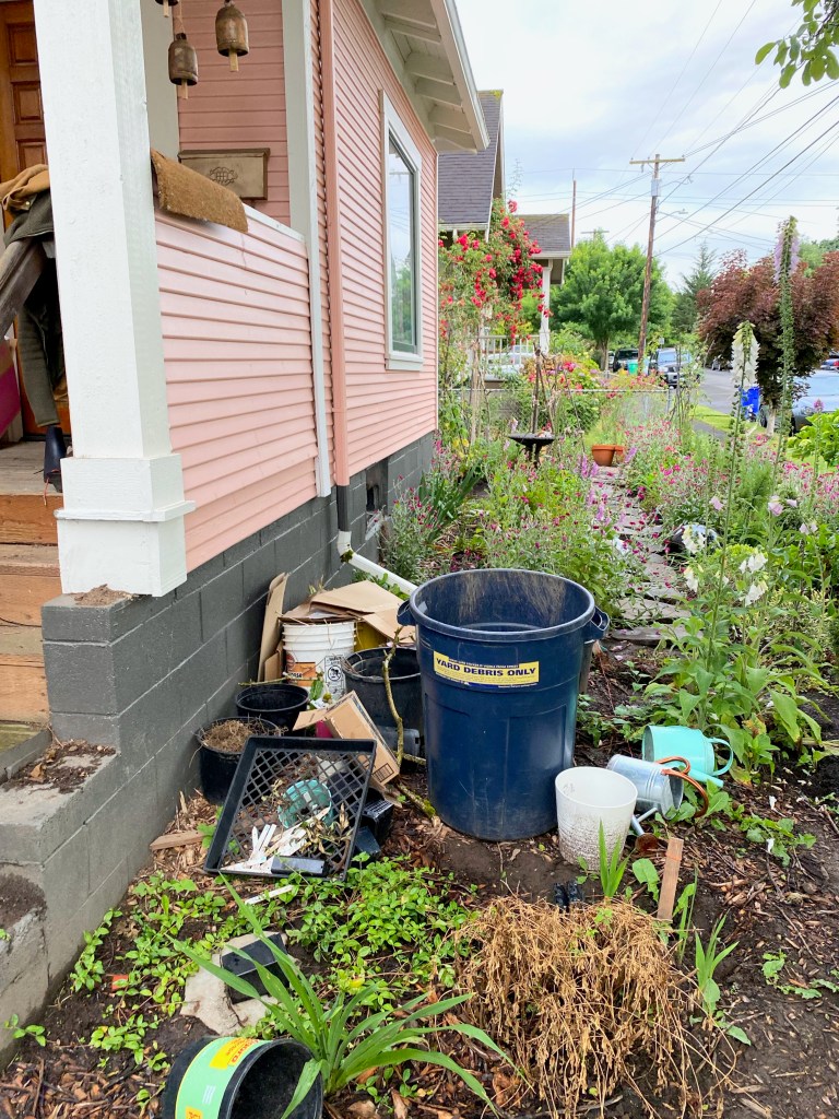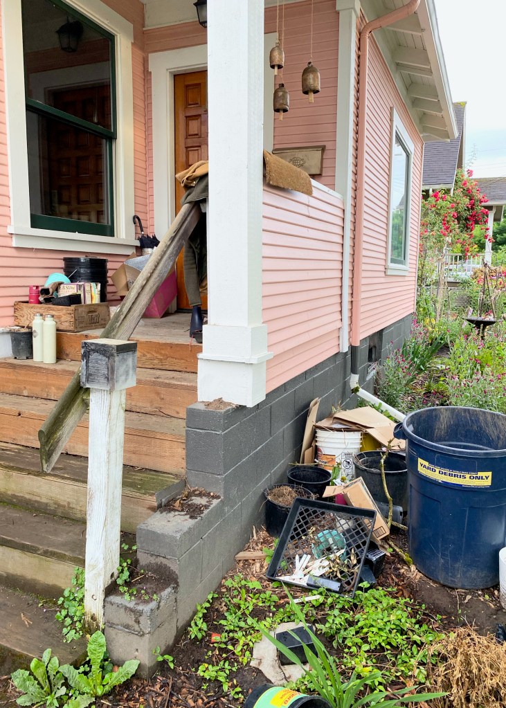 My porch is full of all sorts of messes! I’m hoping to get it all cleared off and remove the siding where the new stairs will be this weekend at the very least. During quarantine, we’ve been using this as a staging area for anything coming into the house as well as stashing extra gardening equipment and gardening cover clothes. Eek!