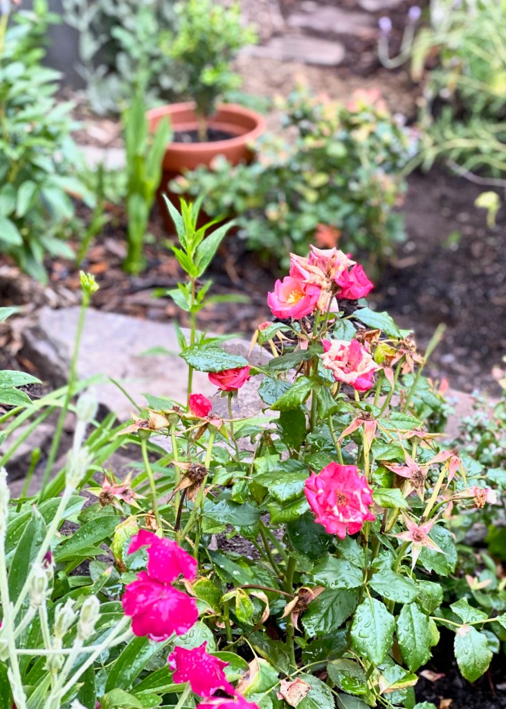 My roses are not liking the rainy weather we’ve had lately. I need to do some deadheading, but the blossoms just rot off immediately with the rain. Ugh. Come on summer, I’m ready for hot days, short skirts, and sunshine!