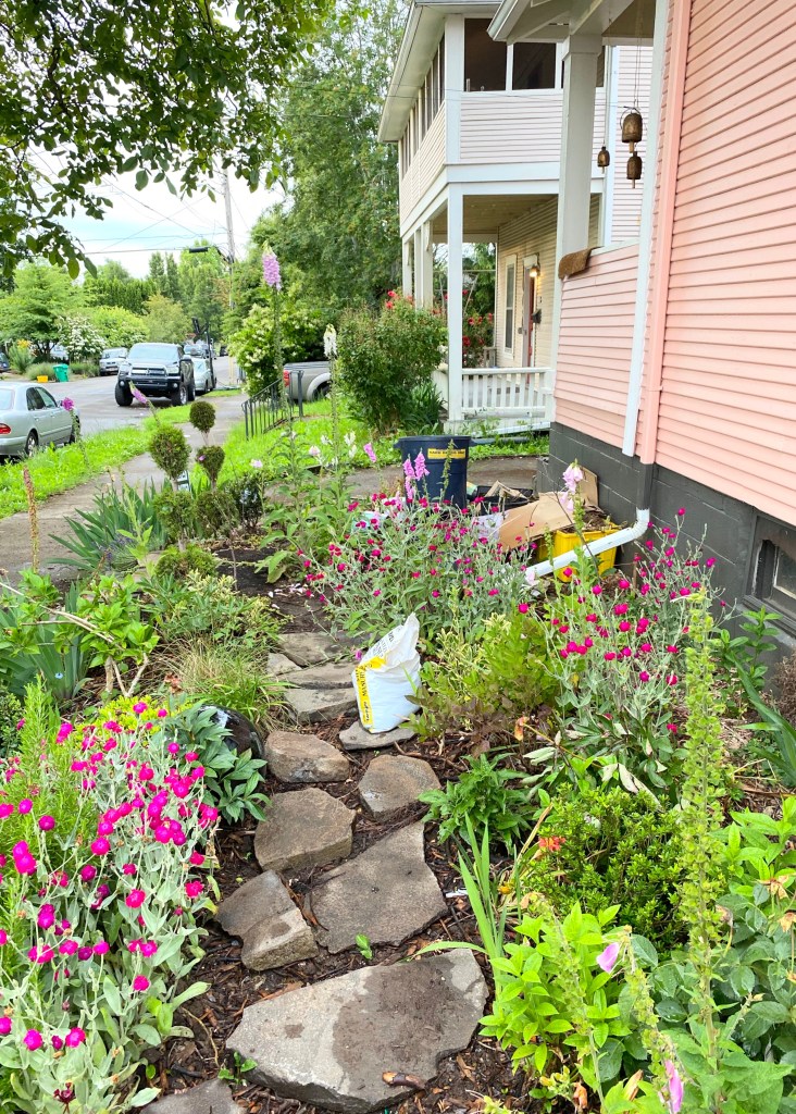 Don’t worry, the garden isn’t all flowers (though, we should definitely talk about how my foxgloves are now over 6′ tall in the comments!), I’ve still got boxes and yard waste bins and nursery pots over here in the area that will eventually be the future stairs! And no, I still haven’t dug in the path stones yet.