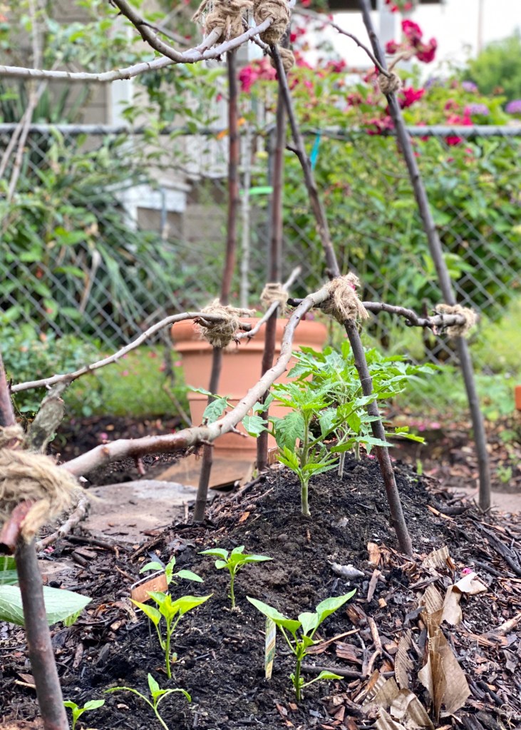 The whole thing is basically a long v-shape. It’s relatively flexible and I’m hoping it will hold up to the weight of the tomato and squash plants! I will definitely keep you updated. For now my tomatoes are still pretty small though. And yes that’s some cardboard that needs to be covered up with mulch.