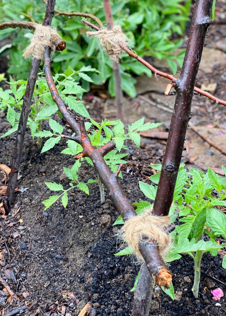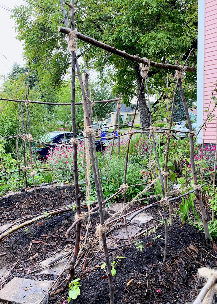 At first I thought I’d use the same system as my raspberry vines – a series of tripod branches tied with jute string. Then I realized that wouldn’t really get the support where I needed it and it would use a massive amount of branches… which I didn’t have. Finally I decided on a modified, more linear system. I like using the natural branches for trellising for a few reasons: one, they blend in well with the natural environment; two, they’re free; and three, they look like they’ve come out of a fairy tale!