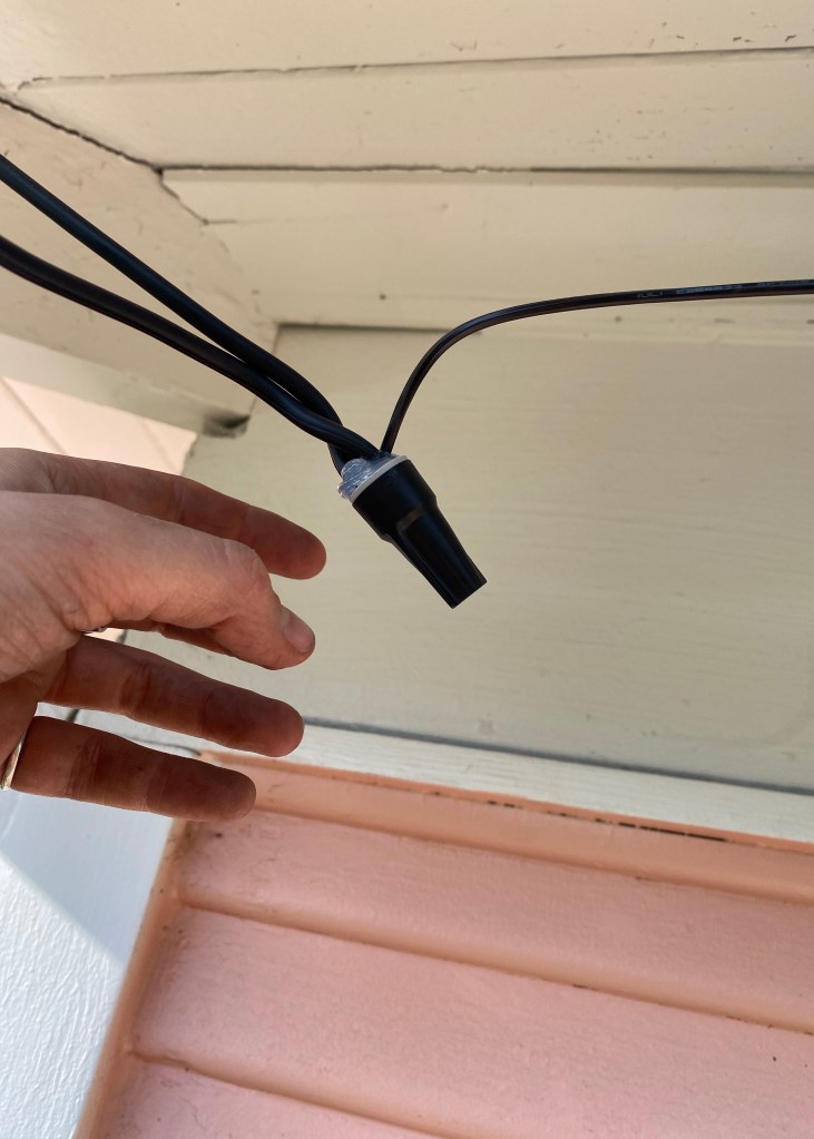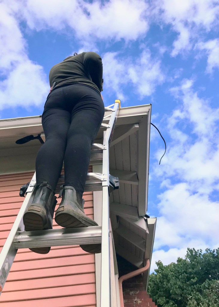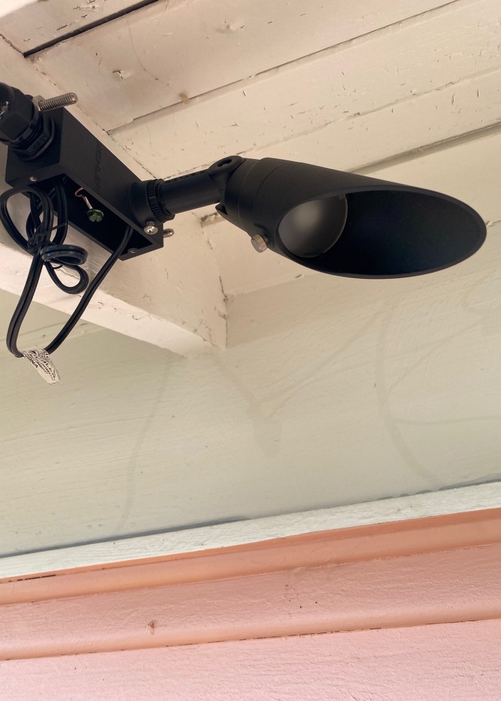 The ground lighting comes with a heavy duty plastic stake (see them above!) that the light fixtures just screw right into; it’s super easy to install! I used a rubber mallet to pound in my stakes where I wanted them, carefully ensuring the stakes were perpendicular to the ground and level vertically. Then I screwed in each fixture. Easy as pie. The lighting installed onto the eaves was not much more difficult, though it resulted in a lot of time spent at the top of a ladder. Of course, my sister, Bronwyn, who was my assistant for the day took lots of pictures of my butt during this process!