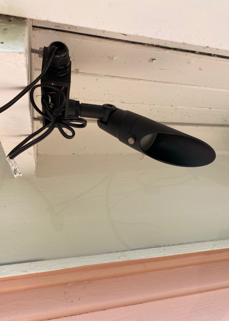 Kichler recommended 35° Flood Lights and 60° Flood Lights for the house. The 35° fixtures were mainly used to light the ground from the eaves while the wider 60° floor lights were mounted in the ground to light the house. The flood lighting comes with a ground mount and then you add the Junction Box Mounting Brackets to install them off the ground. The brackets are pretty cool, because they’re able to install onto a house or a tree and thus they’re designed to allow for a tree’s growth! The flood lights screw right into the junction boxes and then the boxes are installed to the house (or tree) with a couple of woodscrew bolts. I drilled pilot holes for the bolts with a drill bit slightly smaller than the screw threads. After installing the first light, I learned to screw the nut onto the bolt and use pilers on the nut to screw the wood screw part into the rafters under my eaves. On a tree you’d be able to move the nuts up the bolt to allow for the tree’s growth each year, or simply unscrew the wood screw a bit to allow more space. Then it is a matter of slipping the fixture box onto the bolt and adding nuts on the other side. The junction box sits away from the tree or house a bit and you can adjust it accordingly. This was actually super helpful for guiding wires too!