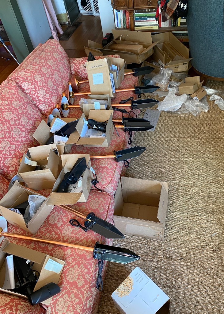 Once the garden was ready for the lighting, I spent a couple hours with my sister one evening, unboxing all the lighting components, assembling the fixtures, and labeling them with their location based on Kichler’s plan. This allowed the actual installation process to go much quicker. I admit, the living room did look quite crazy the next morning though!