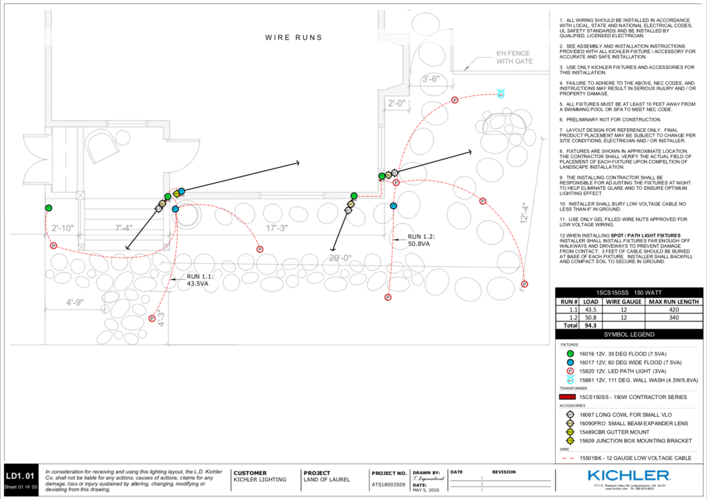 While I often design exterior color palettes and enjoyed designing my own garden landscape, I am by no means a lighting designer! While Kichler doesn’t offer design service directly to the consumer (there are so many awesome landscape lighting professionals who do that!), I am lucky that Kichler’s team took a look at my plan and revised it to make the house look even more impressive. They sent back this plan which added up and down lighting in place of wallwashers and spread out the lighting to showcase the garden better. They also broke the electrical into two runs for me, so I didn’t have to do any of those calculations. This page became my guideline as I started assembling and installing the fixtures too.