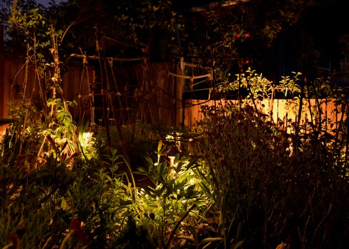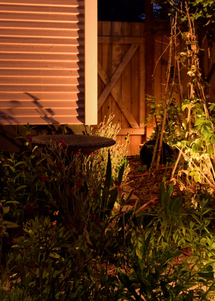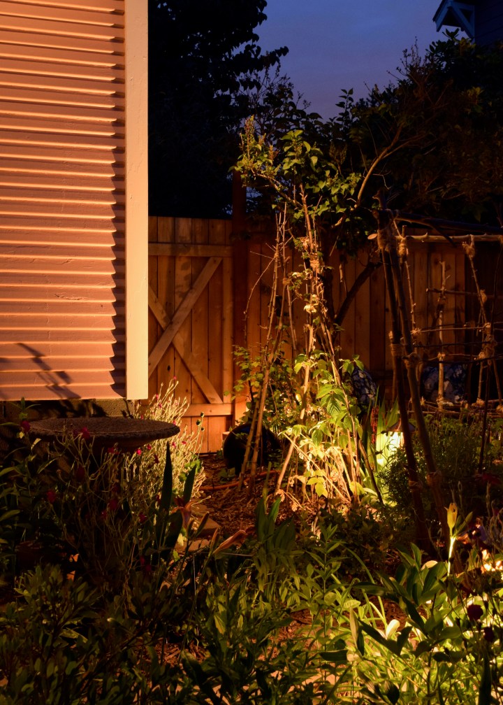 When I ended up adding an espaliered apple tree to the fence at the end of the main path, I decided to switch the location of the wall washer as well. Rather than lighting the back fence (which you can see in the photo above already gets a decent amount of light reflecting off the house and from a path light), I moved it into the vegetable bed to highlight the tree. The bench area is a little moody, but the tree is one of my favorite lighting features now! As the espaliered apple tree grows, the soft lighting is only going to showcase it more. I. CANNOT. WAIT!