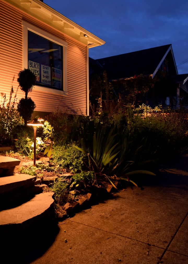 Another benefit of the down lighting mounted to the eaves, is that it casts a wide enough beam of light to capture some of the sidewalk. My neighborhood has very minimal street lighting, so this feels like a great way to help out my neighbors too. The pathlight next to the steps highlights that specific area, but the downlight casts a soft glow over a larger area.