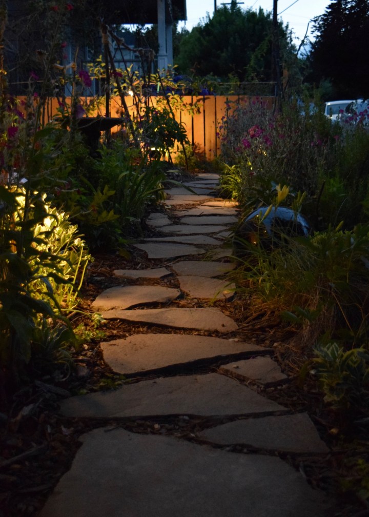 It’s so inviting and draws me into the garden in the evenings when I’d normally be huddled on the couch! Now I sit out on the garden bench with a cocktail and just relax into the night. It’s fun to watch the passersby admiring the garden and the new landscape lighting too!