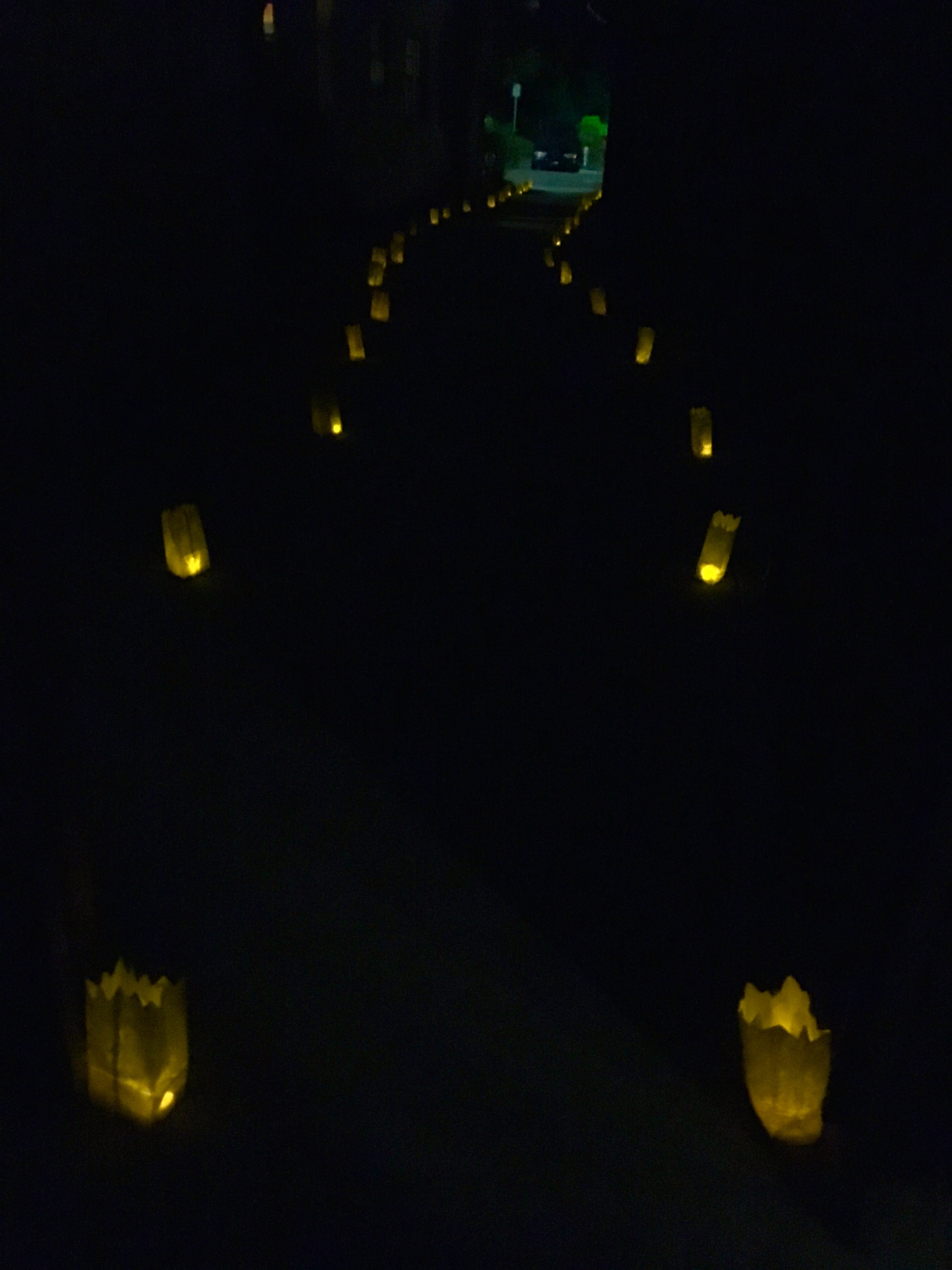 I don’t know what inspired me, but one day at work, I suddenly came up with the ultimate idea: lining the driveway with lights! But how to do this? Lights inside paper bags would put off a softer glow. But, candles are a fire hazard and definitely a no-no in drought-stricken California. What about LED fake tea lights? That is a yes, my friends! Before I could talk myself out of this idea, I hopped onto Amazon and bought these beauties! They are perfect! The amber color really does look like a flame and they flicker just like a real candle would!! I grabbed a ton of paper lunch bags from Smart & Final, cut a jagged top, and filled the bottoms with a small handful of gravel. I placed the bags all along the driveway and then, at dusk, stuck a tea light or two in each bag. They lined the driveway creating a little runway that screamed, “Hey you! Hey, over here! Come down this driveway and get some Halloween candy!” It was perfect! Many of the parents walking with their kids complemented me on the “runway.” It put our hidden-away house right on the map!